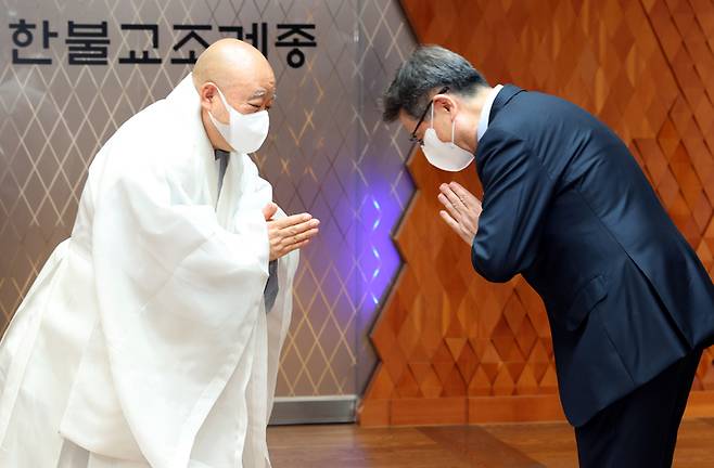 [서울=뉴시스] 박보균 문화체육관광부 장관이 25일 서울 종로구 한국불교역사문화기념관에서 조계종 총무원장 원행스님과 면담을 마치고 인사를 하고 있다. (사진=문화체육관광부 제공) 2022.05.25. photo@newsis.com *재판매 및 DB 금지