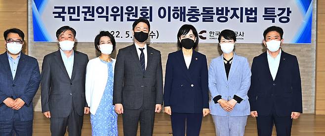 [서울=뉴시스] 홍찬선 기자 =전현희(오른쪽에서 세번째) 국민권익위원장은 25일 서울 강서구 한국공항공사에서 임직원을 대상으로 '공직자의 이해충돌방지법' 특강을 개최했다. 전 위원장은 공직자가 이해출돌 상황에서 심적 갈등 없이 정당하게 직무를 수행하고 국민이 공정한 직무 수행 결과를 보장받도록 하는 이해충돌방지법의 이행에 한국공항공사의 임직원이 적극 협조해줄 것을 당부했다. 사진은 이날 특강에서 전 위원장과 윤형중(왼쪽에서 네번째) 한국공항공사 사장, 이미애(왼쪽에서 세번째) 부사장, 박영선(오른쪽에서 두번재) 상임감사위원 등 임원들과 기념촬영을 하고 있다. (사진=한국공항공사 제공) 2022.05.25. photo@newsis.com