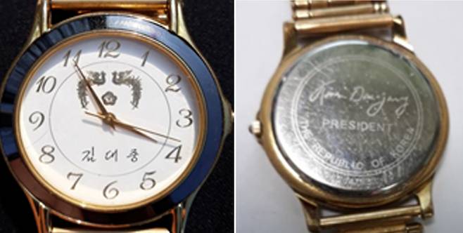 [서울=뉴시스] 대통령실이 25일 공개한 김대중 전 대통령 기념 시계. (사진=대통령실 제공) 2022.05.25. photo@newsis.com *재판매 및 DB 금지