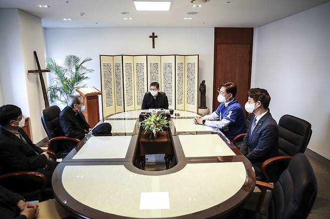 [서울=뉴시스] 최진석 기자 = 송영길 더불어민주당 서울시장 후보가 25일 서울 중구 천주교 서울교구청을 찾아 천주교 서울대교구 정순택 대주교를 예방해 대화를 나누고 있다. (사진=송영길 캠프 제공) 2022.05.25. photo@newsis.com *재판매 및 DB 금지