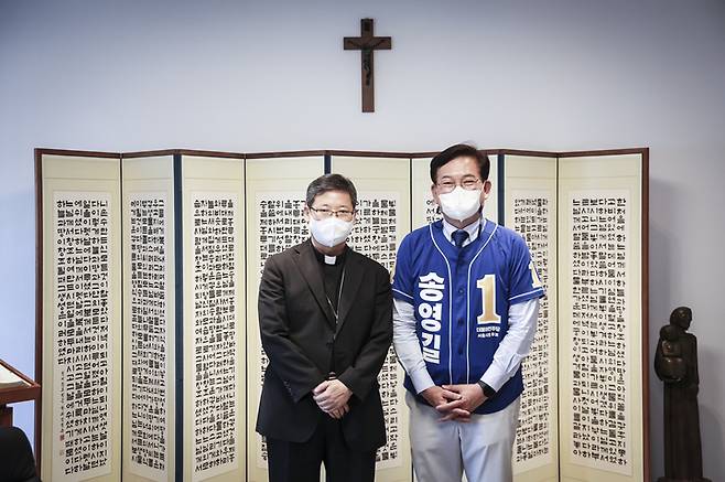 [서울=뉴시스] 최진석 기자 = 송영길 더불어민주당 서울시장 후보가 25일 서울 중구 천주교 서울교구청을 찾아 천주교 서울대교구 정순택 대주교를 예방해 기념촬영하고 있다. (사진=송영길 캠프 제공) 2022.05.25. photo@newsis.com *재판매 및 DB 금지
