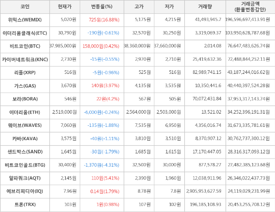 가상화폐 비트코인(+0.42%), 위믹스(+16.88%)