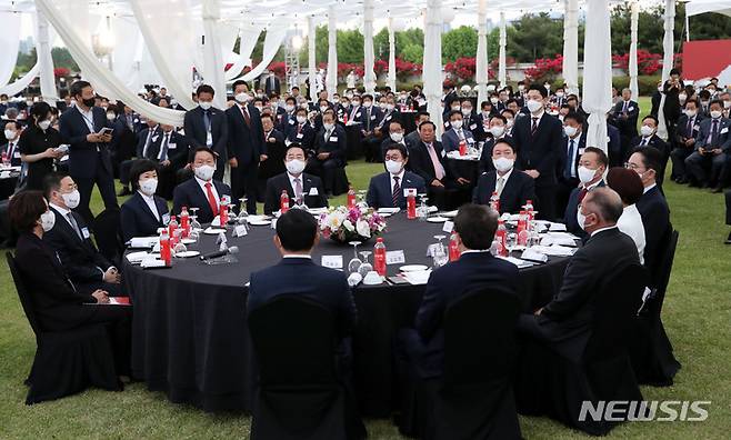 [서울=뉴시스] 전신 기자 = 윤석열 대통령이 25일 서울 용산 대통령실 청사 앞 잔디광장에서 열린 2022 대한민국 중소기업인대회에서 김기문 중소기업중앙회장, 이정한 한국여성경제인협회장, 오세희 소상공인연합회장, 이재용 삼성전자 부회장, 최태원 SK그룹 회장, 정의선 현대자동차그룹 회장, 구광모 LG그룹 회장, 신동빈 롯데그룹 회장 등과 함께 자리하고 있다. 2022.05.25. photo1006@newsis.com
