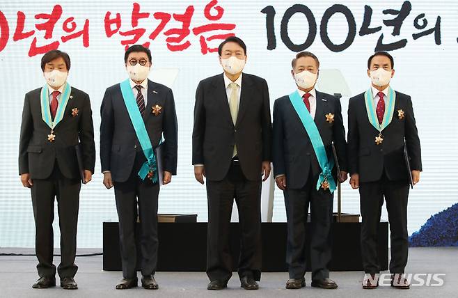 [서울=뉴시스] 전신 기자 = 윤석열 대통령이 25일 서울 용산 대통령실 청사 앞 잔디광장에서 열린 2022 대한민국 중소기업인대회에서 정부포상 수상자들에게 훈장을 수상한 뒤 기념촬영을 하고 있다. 왼쪽부터 윤통섭 비전세미콘㈜ 대표이사, 주보원 삼흥열처리 대표, 윤석열 대통령, 김동우 신우콘크리트산업㈜ 대표이사, 이상규 ㈜사옹원 대표이사. 2022.05.25. photo1006@newsis.com