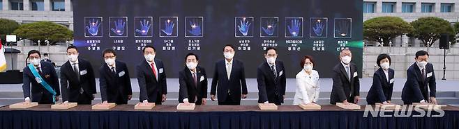 [서울=뉴시스] 전신 기자 = 윤석열 대통령이 25일 서울 용산 대통령실 청사 앞 잔디광장에서 열린 2022 대한민국 중소기업인대회에서 대·중소기업 간 공정과 상생을 통한 신동반성장을 다짐하는 핸드프린팅 퍼포먼스를 하고 있다. 왼쪽부터 주보원 삼흥열처리 대표, 구광모 LG그룹 회장, 강삼권 벤처기업협회장, 최태원 SK그룹 회장, 김기문 중소기업중앙회장, 윤 대통령, 이재용 삼성전자 부회장, 이정한 한국여성경제인협회장, 정의선 현대자동차그룹 회장, 오세희 소상공인연합회장, 신동빈 롯데그룹 회장. 2022.05.25. photo1006@newsis.com