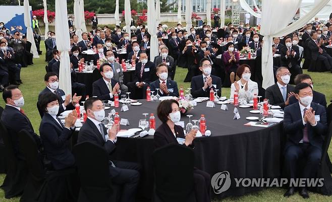 (서울=연합뉴스) 안정원 기자 = 윤석열 대통령이 25일 서울 용산 대통령실 청사 앞 잔디마당에서 열린 2022 대한민국 중소기업인대회에서 신동빈 롯데그룹회장, 정의선 현대자동차그룹 회장, 이재용 삼성전자 부회장, 최태원 SK그룹회장, 구광모 LG그룹 회장과 함께 김기문 중소기업중앙회장의 개회사가 끝난 뒤 박수치고 있다. 2022.5.25