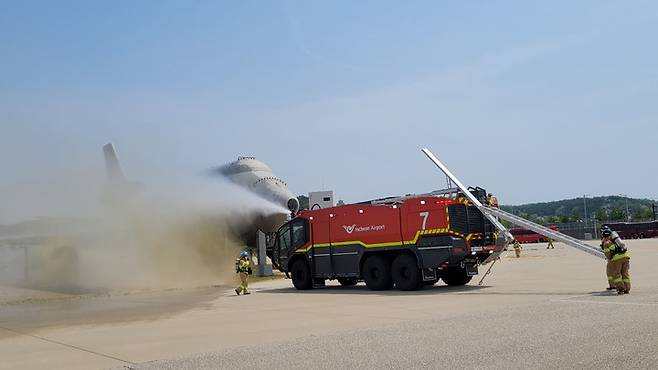 서울소방학교(교장 성호선)는 25일 인천공항공사에서 항공기 사고대응 훈련을 진행했다.