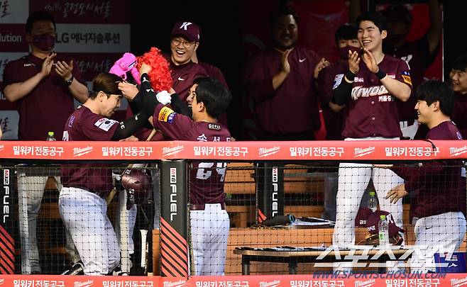 2022 KBO리그 LG트윈스와 키움히어로즈의 경기가 25일 서울잠실야구장에서 열렸다. 키움 3회초 선두타자 김재현이 좌중월 솔로 홈런을 치고 동료들과 하이파이브 하고 있다. 잠실=최문영 기자 deer@sportschosun.com/2022.05.25/