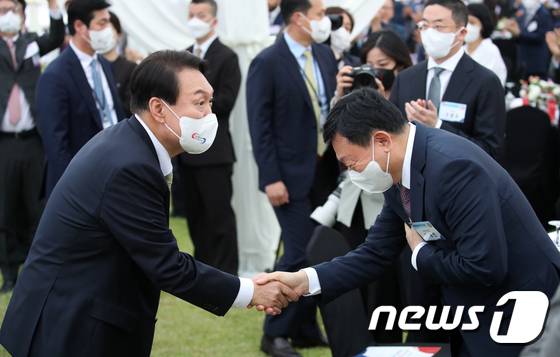 (서울=뉴스1) 오대일 기자 = 윤석열 대통령이 25일 용산 대통령실 청사 앞 잔디마당에서 열린 2022 대한민국 중소기업인대회에서 신동빈 롯데그룹 회장과 악수를 나누고 있다. (대통령실사진기자단) 2022.5.25/뉴스1