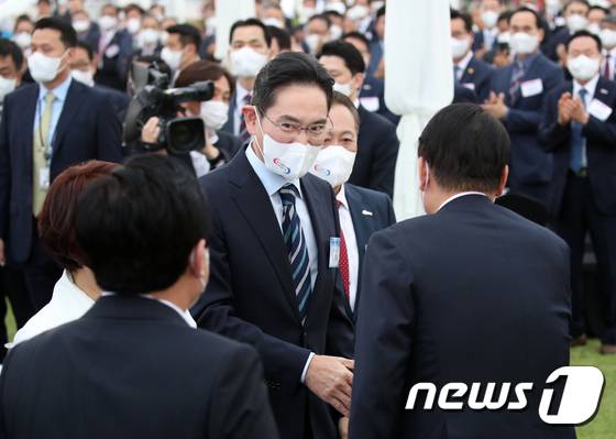 (서울=뉴스1) 오대일 기자 = 윤석열 대통령과 이재용 삼성전자 부회장이 25일 용산 대통령실 청사 앞 잔디마당에서 열린 2022 대한민국 중소기업인대회에서 악수를 나누고 있다. (대통령실사진기자단) 2022.5.25/뉴스1