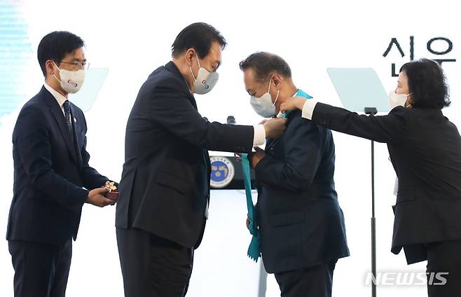 [서울=뉴시스] 전신 기자 = 윤석열 대통령이 25일 서울 용산 대통령실 청사 앞 잔디광장에서 열린 2022 대한민국 중소기업인대회에서 김동우 신우콘크리트산업㈜ 대표이사에게 금탑산업훈장을 수여하고 있다. 2022.05.25. photo1006@newsis.com