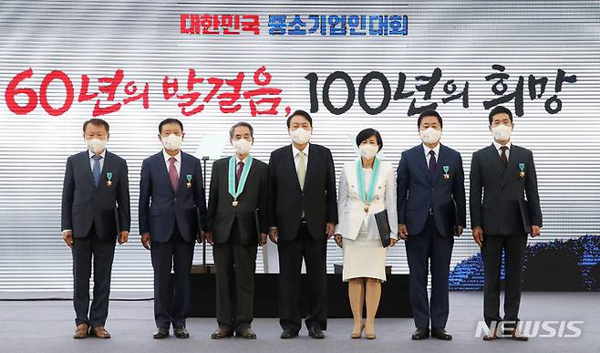 [서울=뉴시스] 전신 기자 = 윤석열 대통령이 25일 서울 용산 대통령실 청사 앞 잔디광장에서 열린 2022 대한민국 중소기업인대회에서 정부포상 수상자들과 기념촬영하고 있다. 2022.05.25. photo1006@newsis.com