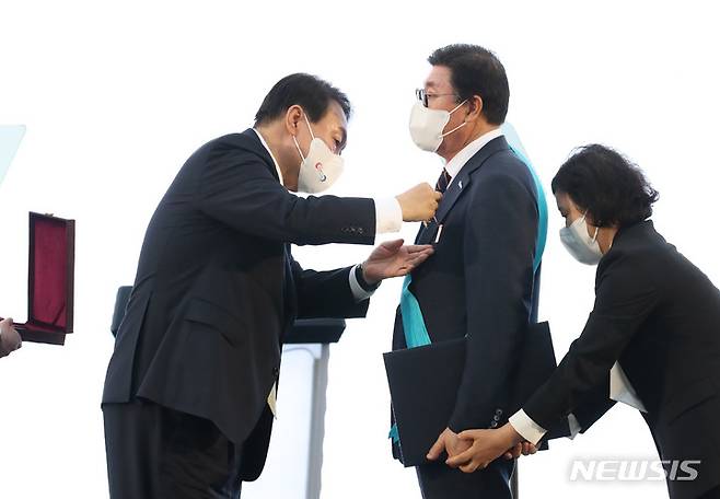 [서울=뉴시스] 전신 기자 = 윤석열 대통령이 25일 서울 용산 대통령실 청사 앞 잔디광장에서 열린 2022 대한민국 중소기업인대회에서 주보원 삼흥열처리 대표에게 금탑산업훈장을 수여하고 있다. 2022.05.25. photo1006@newsis.com
