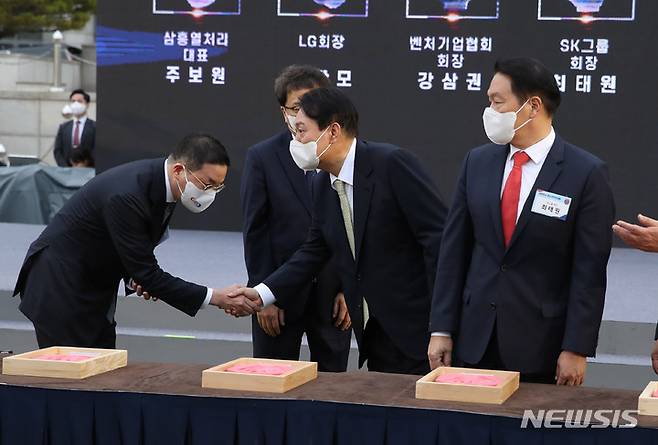 [서울=뉴시스] 전신 기자 = 윤석열 대통령이 25일 서울 용산 대통령실 청사 앞 잔디광장에서 열린 2022 대한민국 중소기업인대회에서 대·중소기업 간 공정과 상생을 통한 신동반성장을 다짐하는 핸드프린팅 퍼포먼스를 마친 후 구광모 LG그룹 회장과 악수하고 있다. 2022.05.25. photo1006@newsis.com