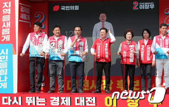(대전=뉴스1) 김기태 기자 = 박희조 국민의힘 대전 동구청장 후보가 25일 대전 동구 역전시장에서 지지를 호소하고 있다. 2022.5.25/뉴스1