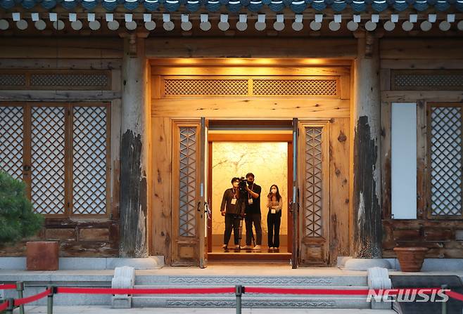 [서울=뉴시스] 이영환 기자 = 청와대 관저 개방을 하루 앞둔 25일 서울 종로구 청와대 본관에서 언론 공개 행사가 진행되고 있다. 오는 26일부터 전면 개방된 창문을 통해 관저 뜰에서 내부를 살펴볼 수 있다. 2022.05.25. 20hwan@newsis.com