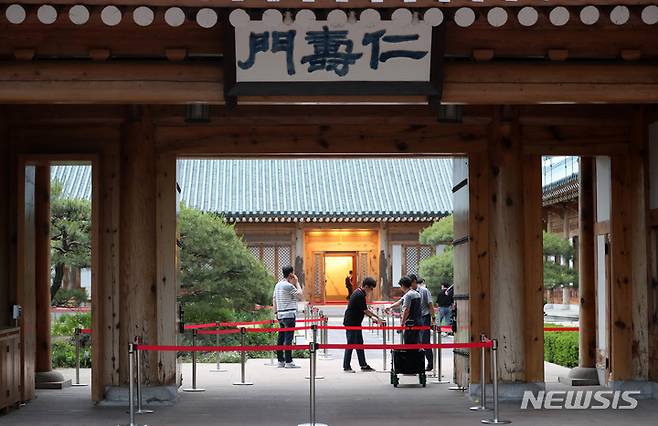 [서울=뉴시스] 이영환 기자 = 청와대 관저 개방을 하루 앞둔 25일 서울 종로구 청와대 본관에서 언론 공개 행사가 진행되고 있다. 오는 26일부터 전면 개방된 창문을 통해 관저 뜰에서 내부를 살펴볼 수 있다. 2022.05.25. 20hwan@newsis.com