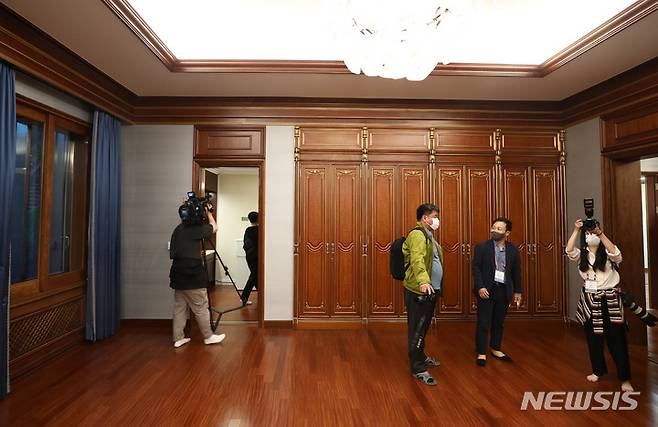 [서울=뉴시스] 이영환 기자 = 청와대 관저 개방을 하루 앞둔 25일 서울 종로구 청와대 본관에서 언론 공개 행사가 진행되고 있다. 오는 26일부터 전면 개방된 창문을 통해 관저 뜰에서 내부를 살펴볼 수 있다. 2022.05.25. 20hwan@newsis.com