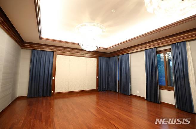 [서울=뉴시스] 이영환 기자 = 청와대 관저 개방을 하루 앞둔 25일 서울 종로구 청와대 본관에서 언론 공개 행사가 진행되고 있다. 오는 26일부터 전면 개방된 창문을 통해 관저 뜰에서 내부를 살펴볼 수 있다. 2022.05.25. 20hwan@newsis.com
