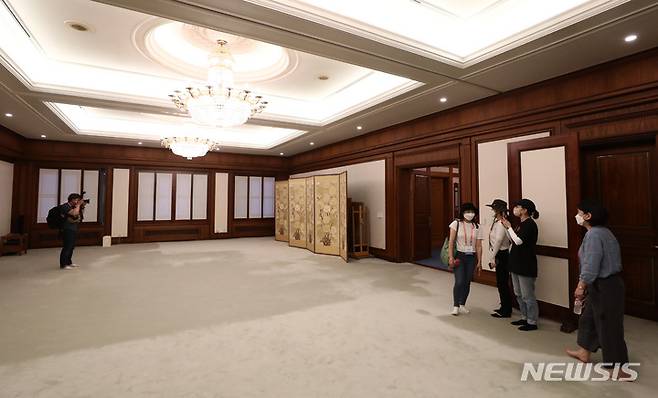 [서울=뉴시스] 이영환 기자 = 청와대 관저 개방을 하루 앞둔 25일 서울 종로구 청와대 본관에서 언론 공개 행사가 진행되고 있다. 오는 26일부터 전면 개방된 창문을 통해 관저 뜰에서 내부를 살펴볼 수 있다. 2022.05.25. 20hwan@newsis.com
