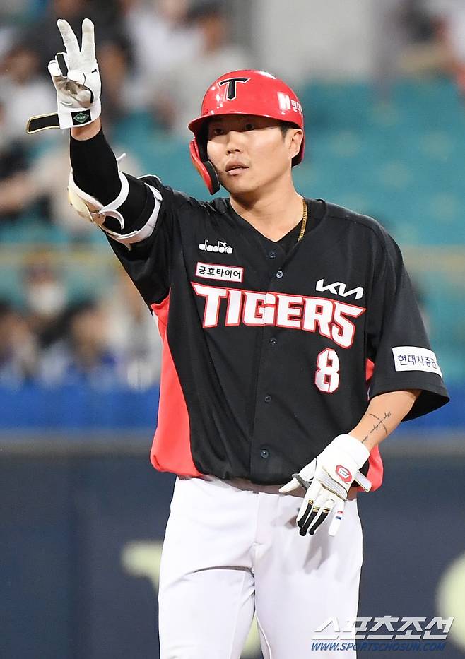 25일 대구 라이온즈파크에서 열린 KIA 타이거즈와 삼성 라이온즈 경기. 5회초 2사 1, 2루 류지혁이 2타점 2루타를 치고 나가 기뻐하고 있다. 대구=정재근 기자 cjg@sportschosun.com/2022.5.25/