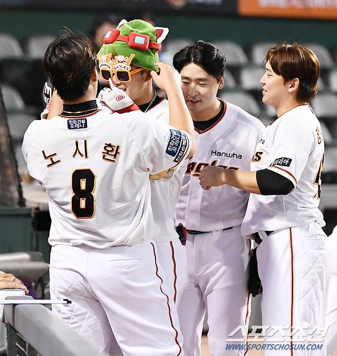 [포토] 홈런 타자 박정현을 반기는 이글스 동료들