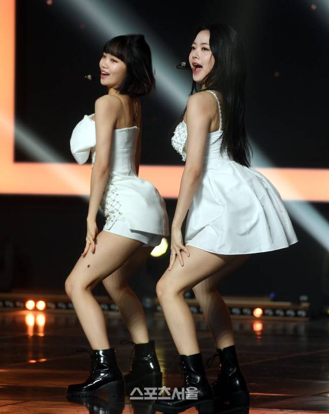 르세라핌 김채원(왼쪽), 홍은채가 25일 일산 MBC드림센터 진행된 MBC M ‘쇼챔피언’에서 공연을 하고 있다.