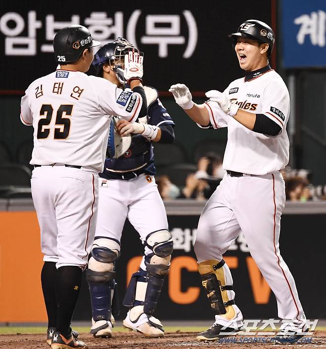 2022 KBO리그 한화 이글스와 두산 베어스의 경기가 25일 한화생명이글스파크에서 열렸다. 8회말 2사 1,2루 한화 노시환 타석 때 대타로 나선 김인환이 스리런포를 날린 뒤 환호하고 있다. 대전=박재만 기자 pjm@sportschosun.com/2022.05.25/