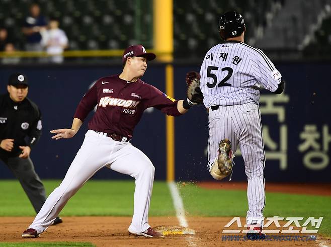 2022 KBO리그 LG트윈스와 키움히어로즈의 경기가 25일 서울잠실야구장에서 열렸다. LG 9회말 선두타자 이재원이 유격수 땅볼로 아웃되고 있다. 잠실=최문영 기자 deer@sportschosun.com/2022.05.25/