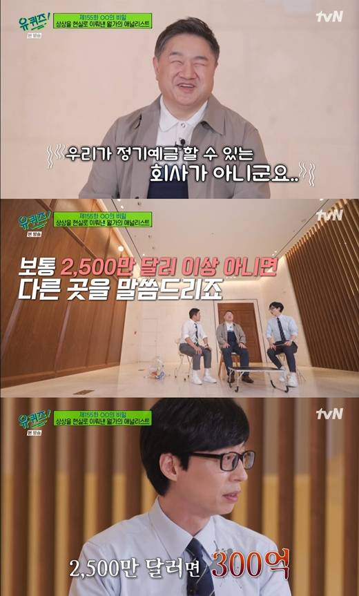 그러자 유재석은 "2500만 달러면 지금 환율로는 300억 정도 된다"며 놀라움을 감추지 못했다. 신순규는 "그 이하면 우리한테는 작은 고객"이라고 덧붙였다.