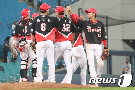 (대구=뉴스1) 공정식 기자 = 25일 오후 대구 삼성라이온즈파크에서 열린 프로야구 '2022 신한은행 SOL KBO리그' KIA 타이거즈와 삼성 라이온즈의 경기, 11 대 5 승리를 거둔 KIA 선수들이 기뻐하고 있다. 2022.5.25/뉴스1