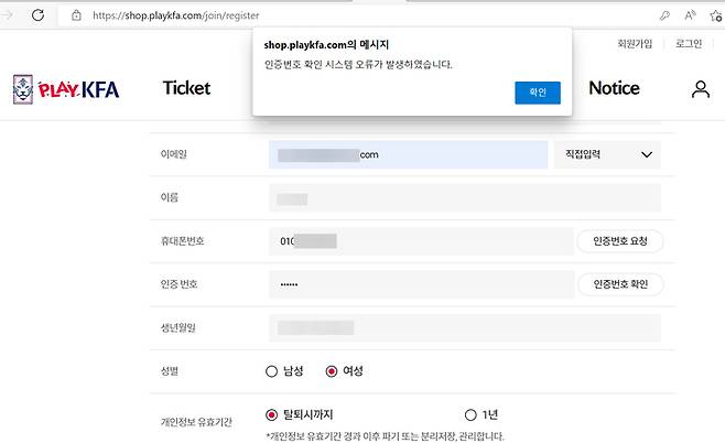 [서울=뉴시스] 조수정 기자 = 프리미어리그 득점왕인 손흥민과 브라질 네이마르의 맞대결로 주목받는 대한민국과 브라질 축구대표팀 평가전 온라인 예매가 시작된 25일 대한축구협회 온라인스토어 사이트가 접속량 폭증으로 회원가입부터 어려움을 겪고 있다. 사진은 회원가입 과정의 인증번호 확인시스템 오류 페이지. (사진=KFA 스토어 캡처) 2022.05.25. photo@newsis.com