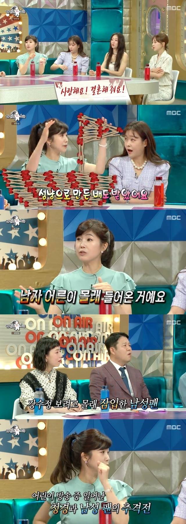 이어 "어린이 동요 방송을 진행하는데 방청객 사이에서 '수정아, 사랑해. 다시 돌아와!'라고 하는 거다. 처음 보는 어른이. 남자 어른이 몰래 들어온 거다. 사람들이 웅성거리고 그 사람을 잡으러 청경들이 100m 달리기를 했다"고 회상해 눈길을 끌었다.