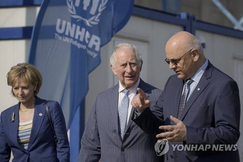 Britain's Prince Charles, center, listens to the head of Romania's Department for Emergency Situations (DSU) Raed Arafat, right, during a visit at a center for refugees fleeing the war in neighboring Ukraine, at the Romexpo convention center, in Bucharest, Romania, Wednesday, May 25, 2022.(AP Photo/Vadim Ghirda)