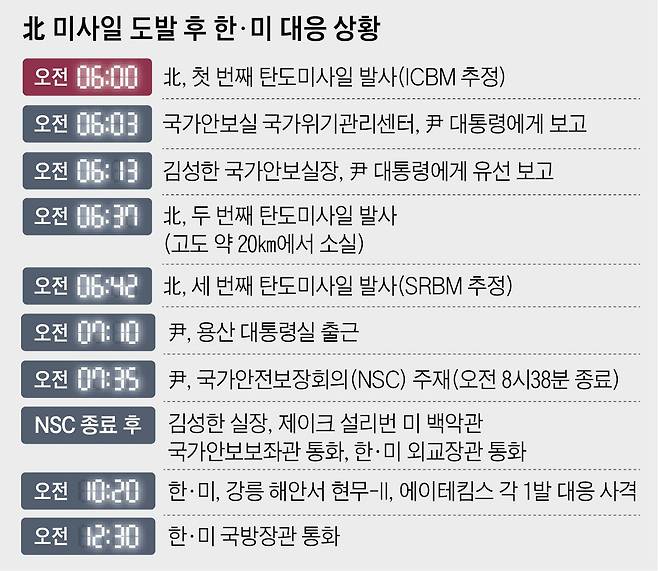북한이 탄도미사일을 쏜 시각(25일 오전 6시~6시 42분) 역시 전략적으로 계산된 것이라는 분석이 나온다. 당시 한일 순방을 마친 바이든 미 대통령은 전용기를 타고 워싱턴DC로 향하던 도중이었다. 한미 정상이 정상회담 등에서 언급한 확장 억제 수단으로서의 핵을 명기하고 미 전략자산 전개, 한미연합훈련 확대 등 대북 안보 협력 메시지에 대한 정면 반발이라는 것이다.