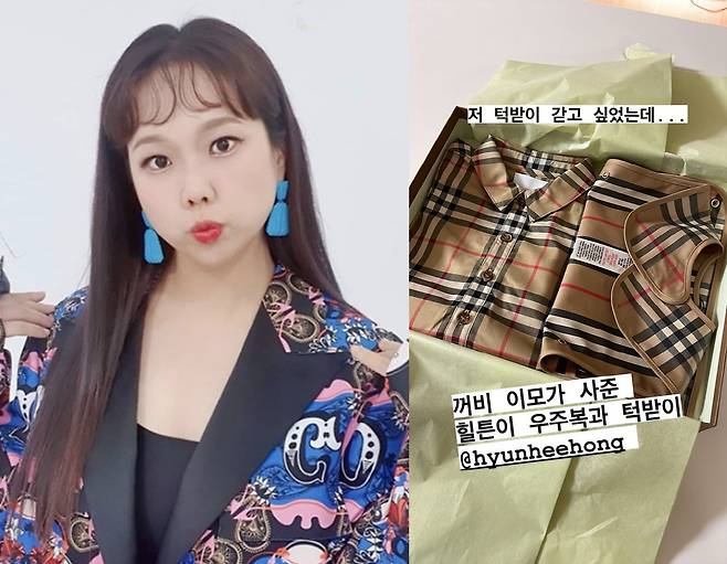 공개된 사진 속에는 김영희와 뱃속에 있는 아이를 위해 소고기를 쏜 홍현희의 모습이 담겼다. 이어 김영희는 "저 턱받이 갖고 싶었는데…꺼비 이모가 사준 힐튼이 우주복과 턱받이"라며 또 한 장의 사진을 게재했다.