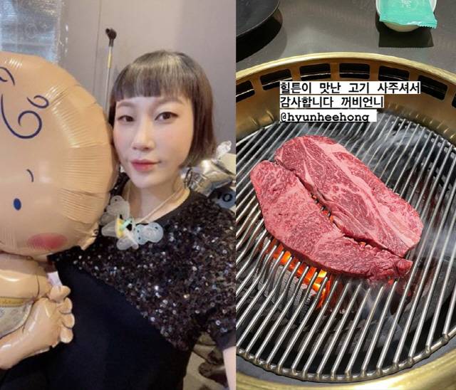 김영희는 25일 자신의 SNS를 통해 "힐튼이 맛난 고기 사주셔서 감사합니다 꺼비언니"라는 글과 함께 한 장의 사진을 게재했다.