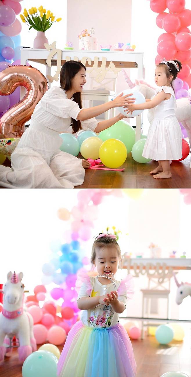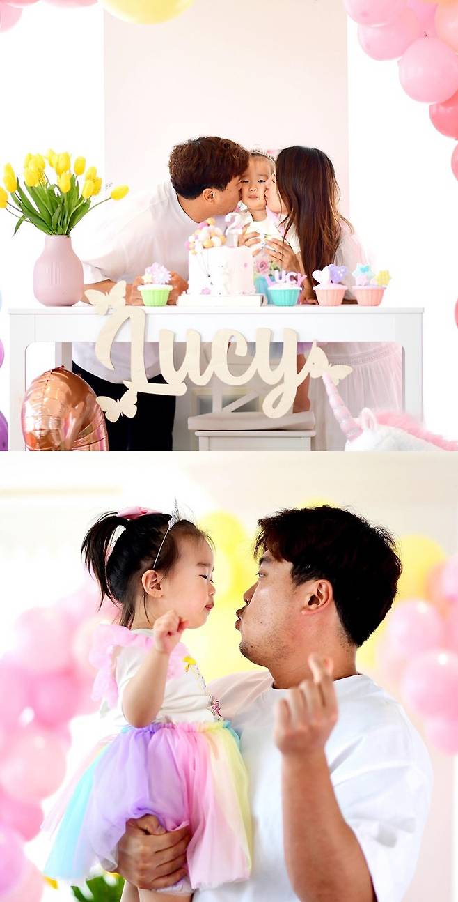 공개된 사진 속 류현진 배지현 부부는 딸의 두번째 생일파티를 화려하게 열어준 모습. 부부는 딸에게 뽀뽀를 하며 애정을 한껏 표현하고 있다. 그런 엄마 아빠의 사랑을 듬뿍 받으며 환하게 웃고 있는 딸의 모습이 랜선 이모, 삼촌들의 미소를 자아낸다.