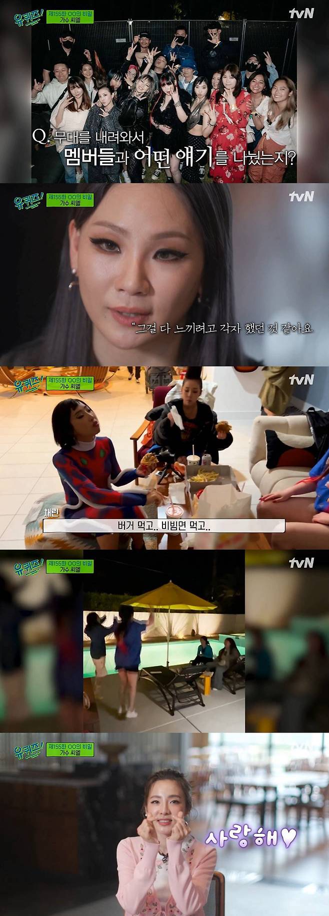 화려한 무대 후에는 침묵과 환호가 함께 왔다고. 2NE1 멤버들은 숙소로 돌아가는 내내 한 마디도 하지 않았지만, 마음을 정리한 뒤에는 함께하는 순간을 소중하게 보냈다는 후문. 씨엘은 "이제는 얼마나 소중한지 아니까 그걸 다 느끼려고 각자 보냈던 시간 같다. 그렇게 간직하고 집에 가서 버거 먹고 비빔면 먹고 투애니원 노래 들으면서 밤새도록 춤 추고 놀았다. 저는 멤버들 앞에서 한 번도 운 적 없는데 그날은 눈물이 너무 났다"고 했다.