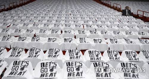 epa09976044 T-shirts with 'Let's Go Heat' await fans in the arena before the Miami Heat host the Boston Celtics during Game 5 of the NBA Eastern Conference Finals series between the Miami Heat and the Boston Celtics at FTX Arena in Miami, Florida, USA, 25 May 2022. EPA/RHONA WISE SHUTTERSTOCK OUT
