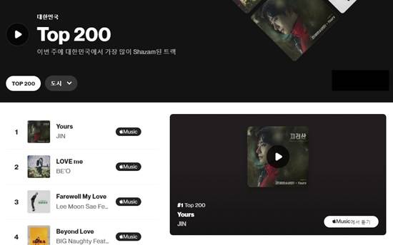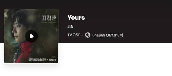 방탄소년단 진이 부른 tvN 15주년 특별기획 '지리산' OST 'Yours'가 글로벌 음원 검색 사이트 샤잠 '글로벌 Top200' 차트 2위를 차지했다.