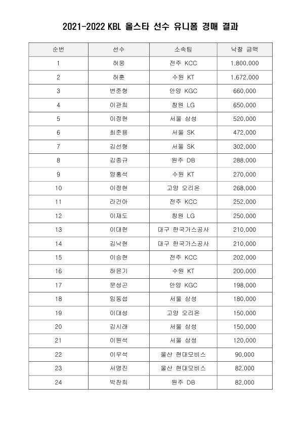KBL이 지난 18일(수)부터 24일(화)까지 진행된 2021~2022 시즌 프로농구 올스타 선수 유니폼 경매 결과를 발표했다.