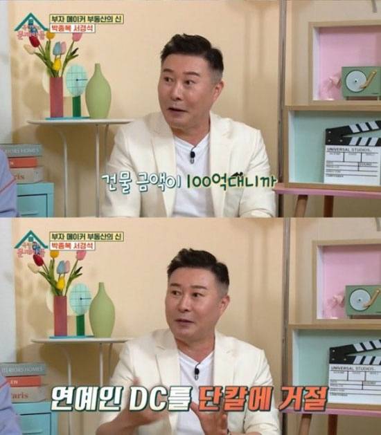 이에 김종국이 '연예인들이 본능적으로 DC를 원한다'고 덧붙이자, 박종복은 "모 연예인이 그런 적이 있다. 사옥을 하나 사려고 하는데 '저 톱스타인데 2억만 깎아 달라'라고 했다"면서 "건물이 100억대라 전혀 불가능하지는 않았지만 건물주가 단칼에 거절하더라"라고 해 눈길을 끌었다.