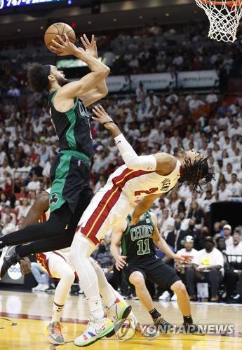 epa09976129 Boston Celtics guard Derrick White (L) fouls Miami Heat guard Gabe Vincent (R) during the first half of Game 5 of the NBA Eastern Conference Finals series between the Miami Heat and the Boston Celtics at FTX Arena, in Miami, Florida USA, 25 May 2022. EPA/RHONA WISE SHUTTERSTOCK OUT