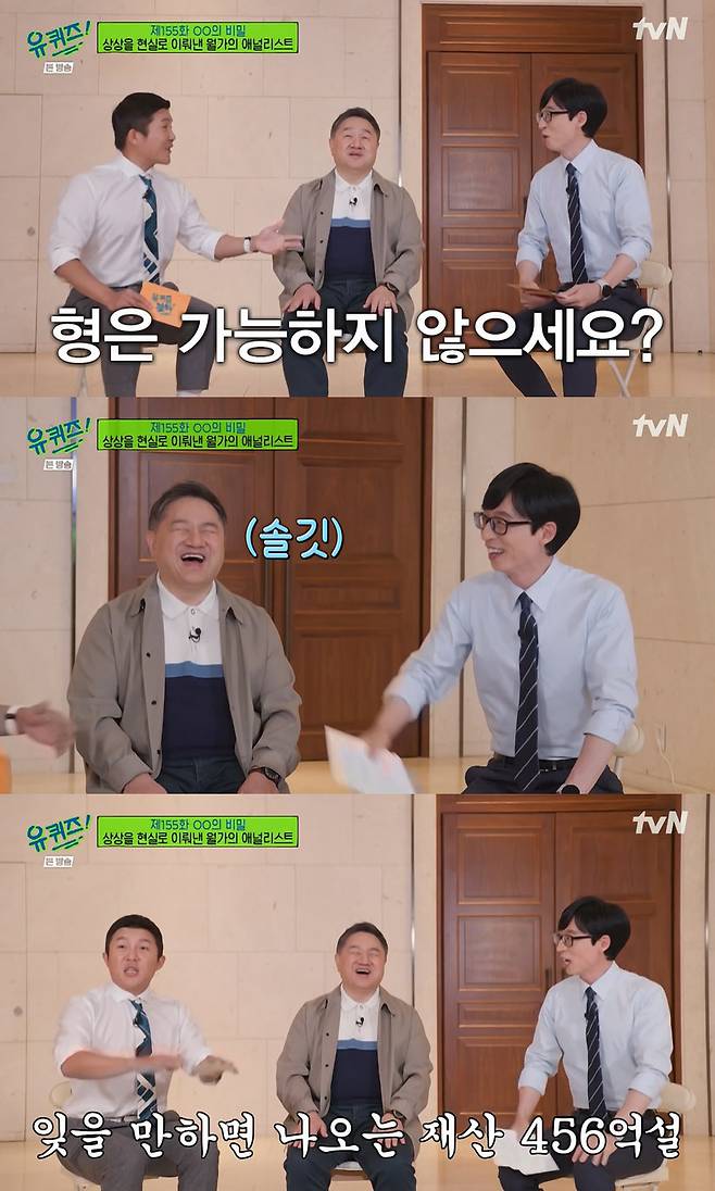 그러자 조세호는 "형은 가능하지 않나"라며 재산 456억이라는 소문을 언급했고 유재석은 "조용히 해! 오징어 게임 때문에 내 재산 얘기가 계속 나온다"라고 당황했다.