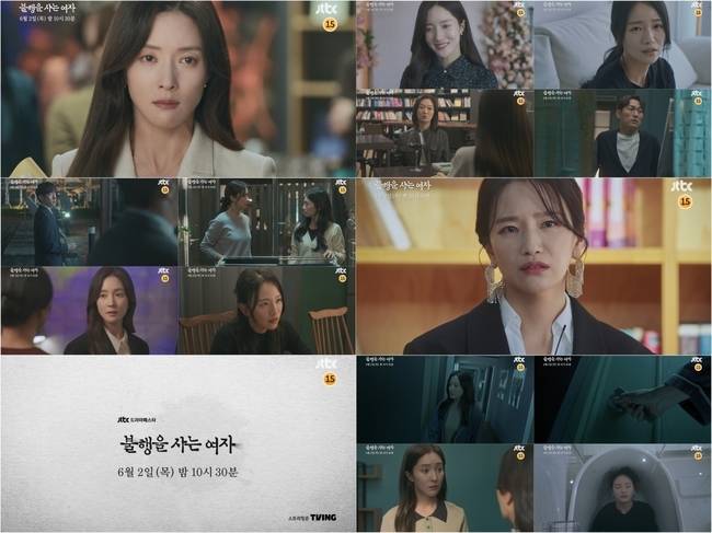 정수연은 이를 모두 “난 언니가 좋아할 것 같아서 한 건데”라며 해명한다. 마치 판도라의 상자처럼 그에게서 새어나오는 불행의 기운을 느낀 것은 차선주만이 아닌 듯, 남편 역시 “당장 내보내”라며 목소리를 높인다. 부부 관계까지 흔들리는 상황에 결국 차선주의 불안은 폭발하고 만다. 그러나 이에 “왜 이렇게 흥분해”라며 태연히 대꾸하는 정수연의 모습은 이 모든 것이 아직 절정이 아님을 암시한다. 아름답던 우정이 깨지고, 서로에게 있어 불행의 열쇠가 된 두 여자. 그런 가운데 이들의 얼굴 위에서 흩어지는 “만약 그녀가 없었더라면, 나는 얼마나 더 불행했을까?”라는 자문은 미스터리를 더한다. 서로의 존재로 인해 달라지는 불행의 값어치, 그렇기에 더욱 기꺼이 ‘불행을 사는 여자’는 둘 중 과연 누구일지 궁금증이 증폭된다.(사진=JTBC)