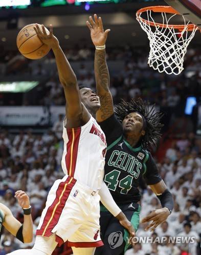 epa09976186 Boston Celtics center Robert Williams (R), knocks the ball away from Miami Heat forward Victor Oladipo (L), during the second half of Game 5 of the NBA Eastern Conference Finals series between the Miami Heat and the Boston Celtics at FTX Arena, in Miami, Florida USA, 25 May 2022. EPA/RHONA WISE SHUTTERSTOCK OUT