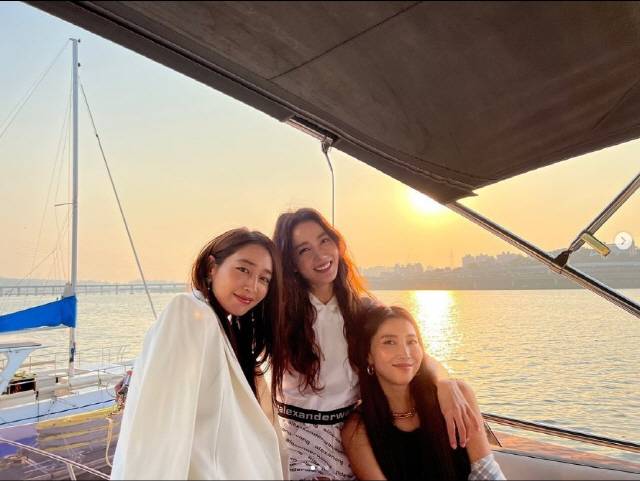 사진 속에는 노을이 지는 강을 배경으로 럭셔리한 요트를 타고 파티 분위기를 내고 있는 오윤아, 이민정, 이소연의 모습이 담겼다. 특히 세 사람은 마치 화보 느낌으로 사진을 담아 시선을 모았다.