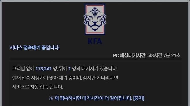 오후 4시 30분부터 '플레이 KFA' 사이트에 들어가기 위해 기다리는 인원만 10만 명을 넘어섰고 오후 5시 이후에 접속을 시도하면 대기 시간이 '48시간'으로 표시되기도 했습니다.