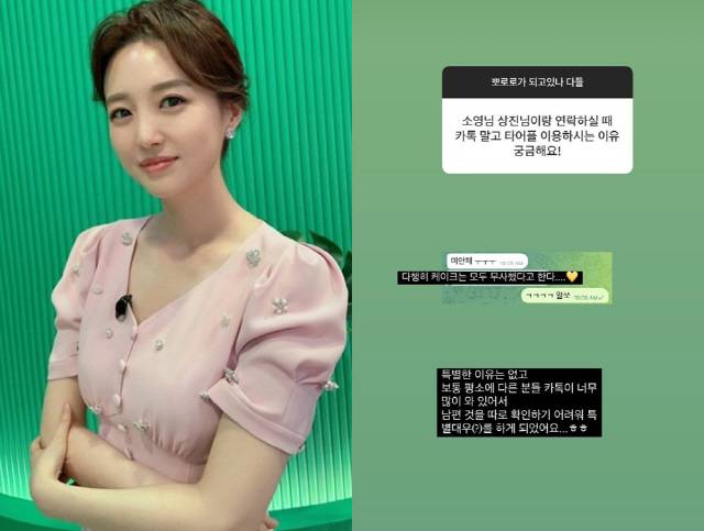 이날 한 누리꾼은 "소영님 상진님이랑 연락하실 때 카톡 말고 타어플 이용하시는 이유 궁금해요"라고 질문을 했다. 이에 김소영은 "특별한 이유는 없고 보통 평소에 다른 분들 카톡이 너무 많이 와 있어서 남편 것을 따로 확인하기 어려워 특별대우(?)를 하게 되었어요...ㅎㅎ"라고 답변을 했다.